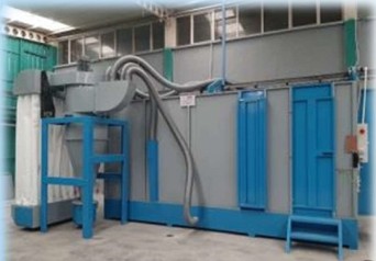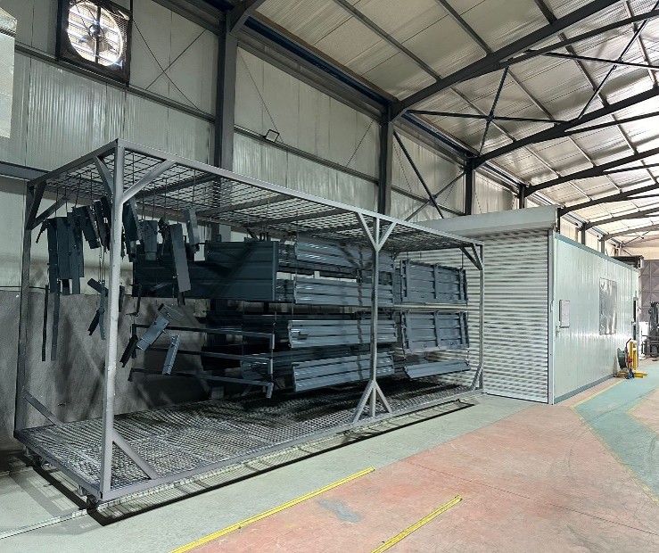 Dış ortama herhangi bir toz boya sızdırmadan içeride toz boyama uygulaması yapılmaktadır. Ön ve arka kapıları otomotik açılır kapanır, zemindeki rayların yardımı ile boyama arabası kolaylıkla Box fırınlarımıza sevk edilebilmektedir.